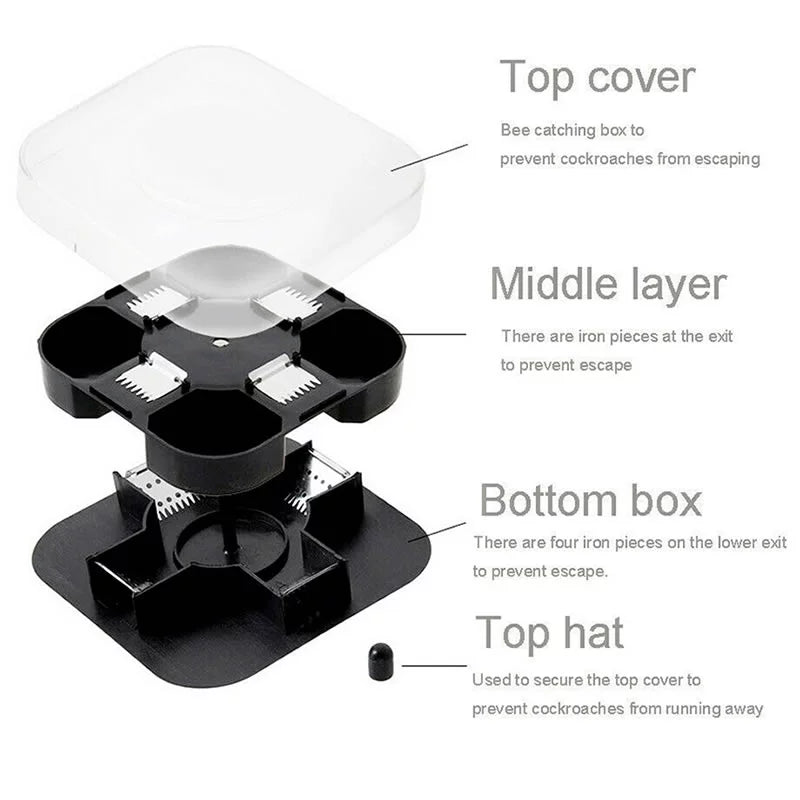 Trapping mechanism: Features a physical trapping mechanism that efficiently captures roaches upon entry, eliminating the need for chemical insecticides.